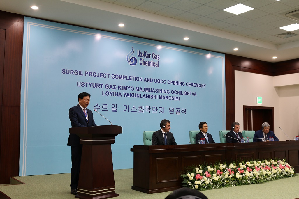 [우즈벡 가스화학단지 완공식 발표 중인 신동빈 회장]