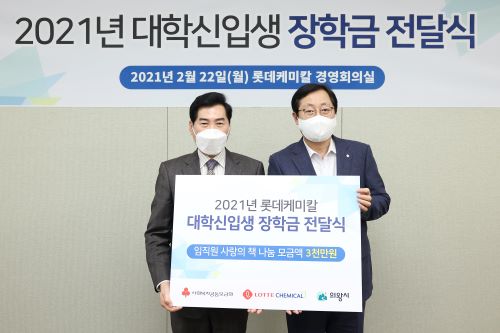 이번 장학금은 롯데케미칼 임직원이 ‘사랑의 책 나눔’ 캠페인을 통해 자체적으로 모금한 것으로, 올해 대학에 입학하는 신입생 15명에게 지원될 예정이다.