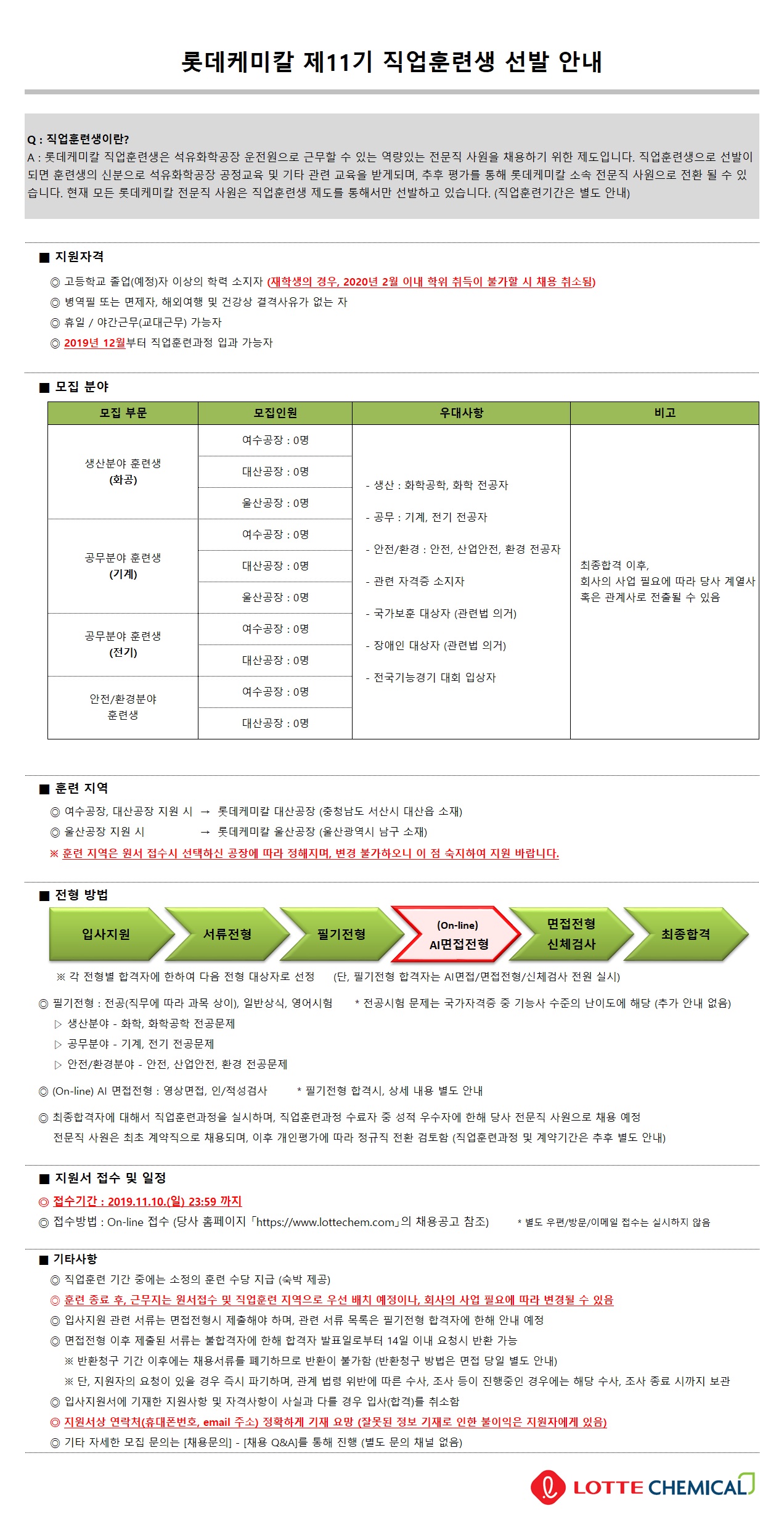 롯데케미칼 11기 직업훈련생 선발 안내